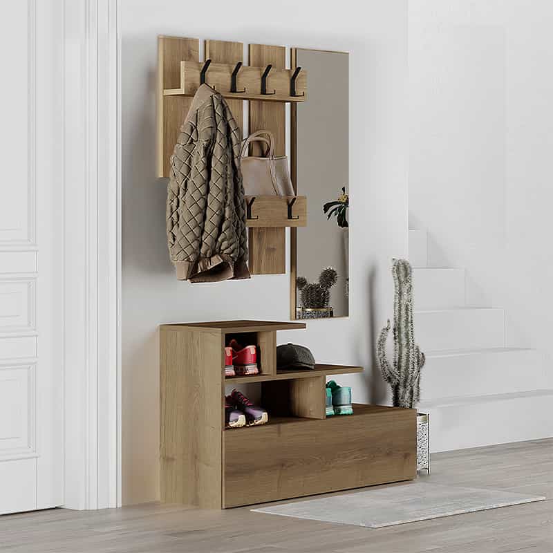 - Φέρει μία κρεμάστρα τοίχου, έναν καθρέφτη και τέσσερα ράφια.
