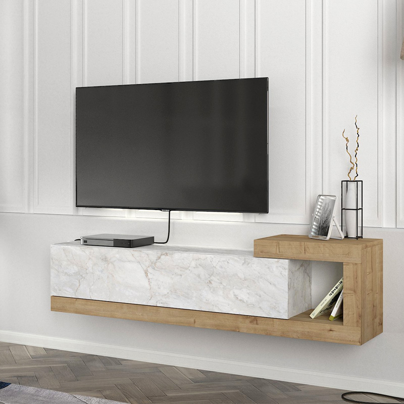 Έπιπλο τηλεόρασης επιτοίχιο Volare Megapap χρώμα λευκό εφέ μαρμάρου – sapphire oak 150×29,6×38,6εκ.
