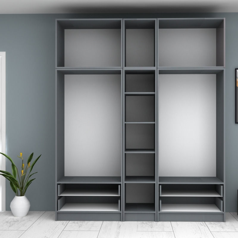 • Στο εσωτερικό της φέρει δύο μεταλλικές βέργες για κρεμάστρες. Στο κάτω μέρος φέρει τέσσερα πρακτικά συρόμενα συρτάρια.