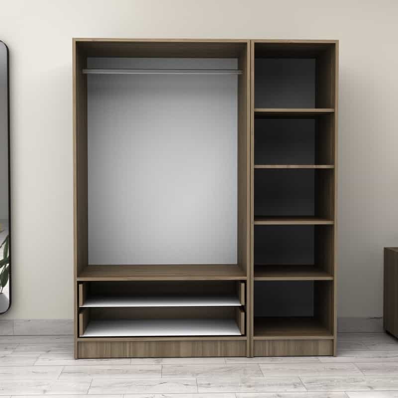 • Στο εσωτερικό της φέρει μια μεταλλική βέργα για κρεμάστρες και ράφια για μεγαλύτερη αποθήκευση. Στο κάτω μέρος φέρει δύο πρακτικά συρόμενα συρτάρια.