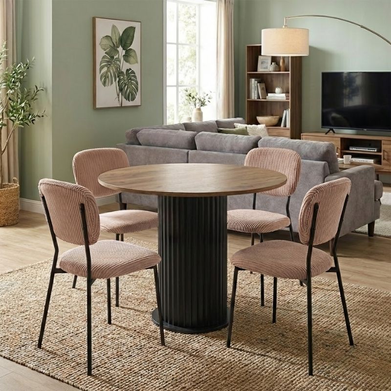 Η τραπεζαρία Bohema – Kevin θα φέρει μία αίσθηση εκλεπτυσμένης κομψότητας στον χώρο σας. Το πλούσιο κοτλέ ύφασμα της καρέκλας χαρίζει ζεστασιά και υφή, ενώ τα μεταλλικά πόδια προσδίδουν μοντέρνο χαρακτήρα και σταθερότητα. Ιδανική επιλογή τόσο για το σπίτι όσο και για επαγγελματικούς χώρους που θέλουν να επικοινωνήσουν ποιότητα και design σε κάθε λεπτομέρεια.
